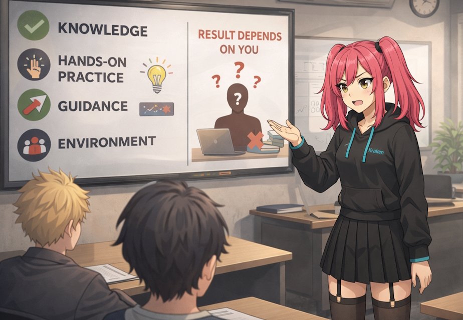 Именно этот опыт сильно повлиял на то, как устроена Kraken Academy. Это не абстрактная идея и не бизнес-план, придуманный на бумаге. Это результат вполне конкретных выводов о том, что в обучении реально работает, а что существует в основном для продажи.